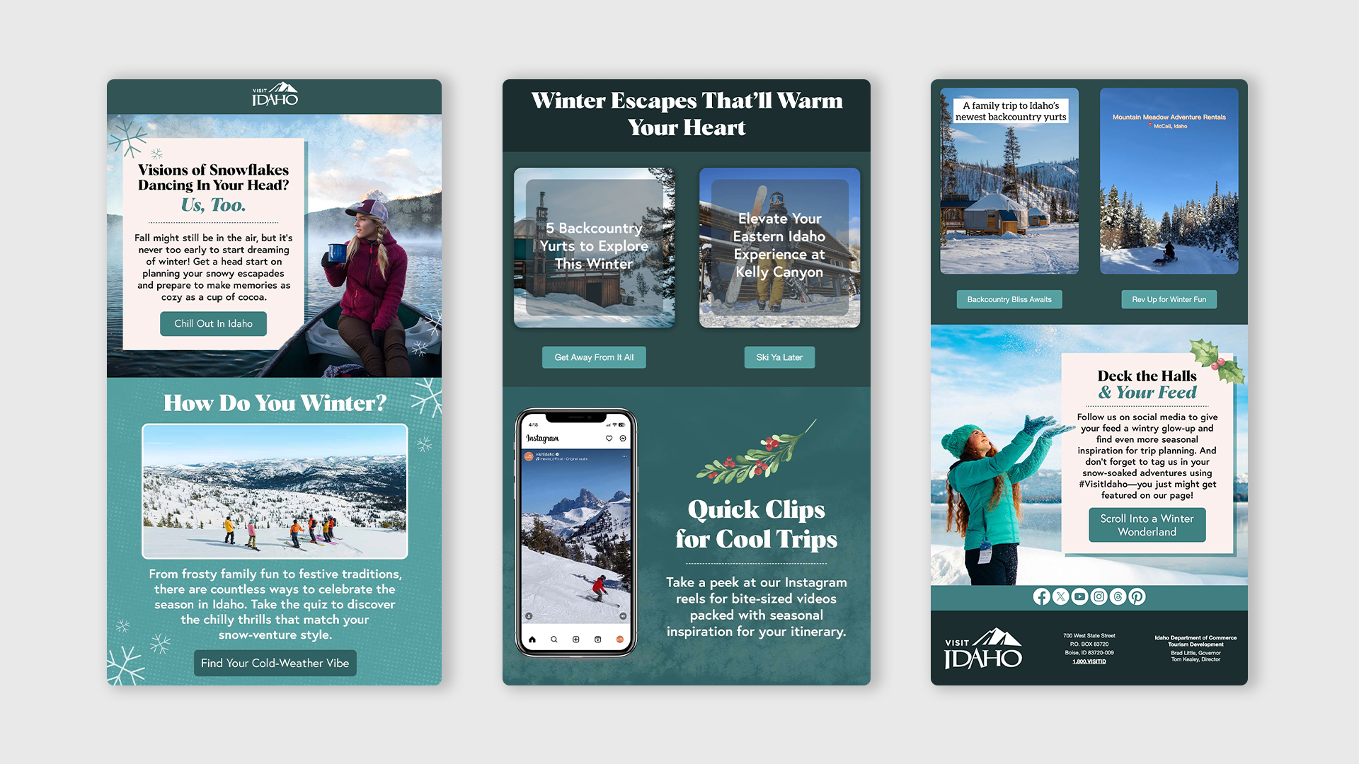 Visit Idaho wanted an updated look and feel for their monthly consumer email newsletters. The click-through rates for the previous email designs were low, so I aimed to create a customized look rather than use the standard templates and blocks.